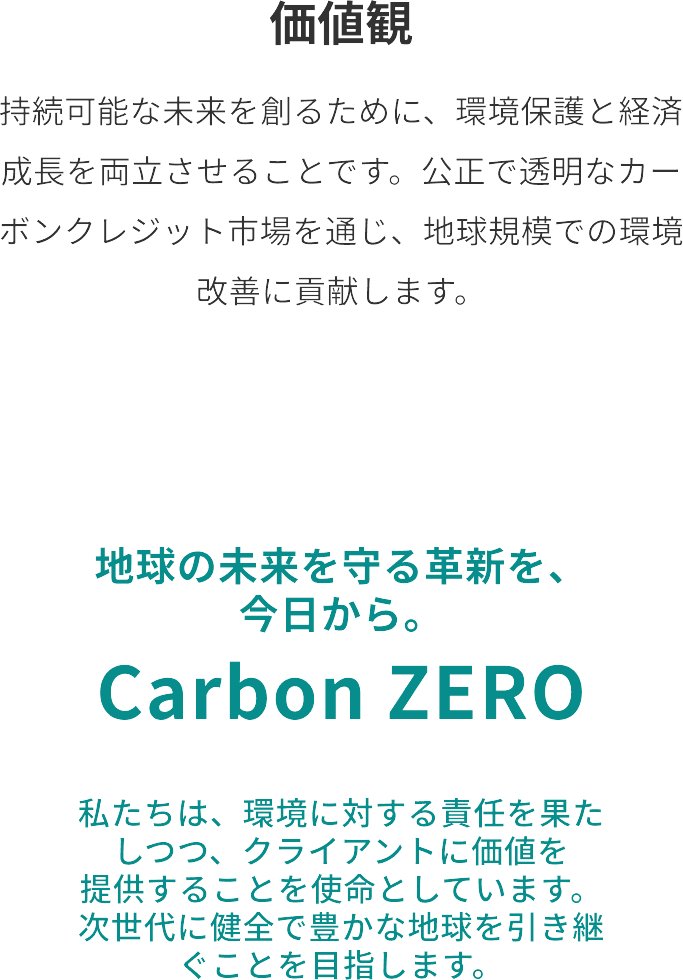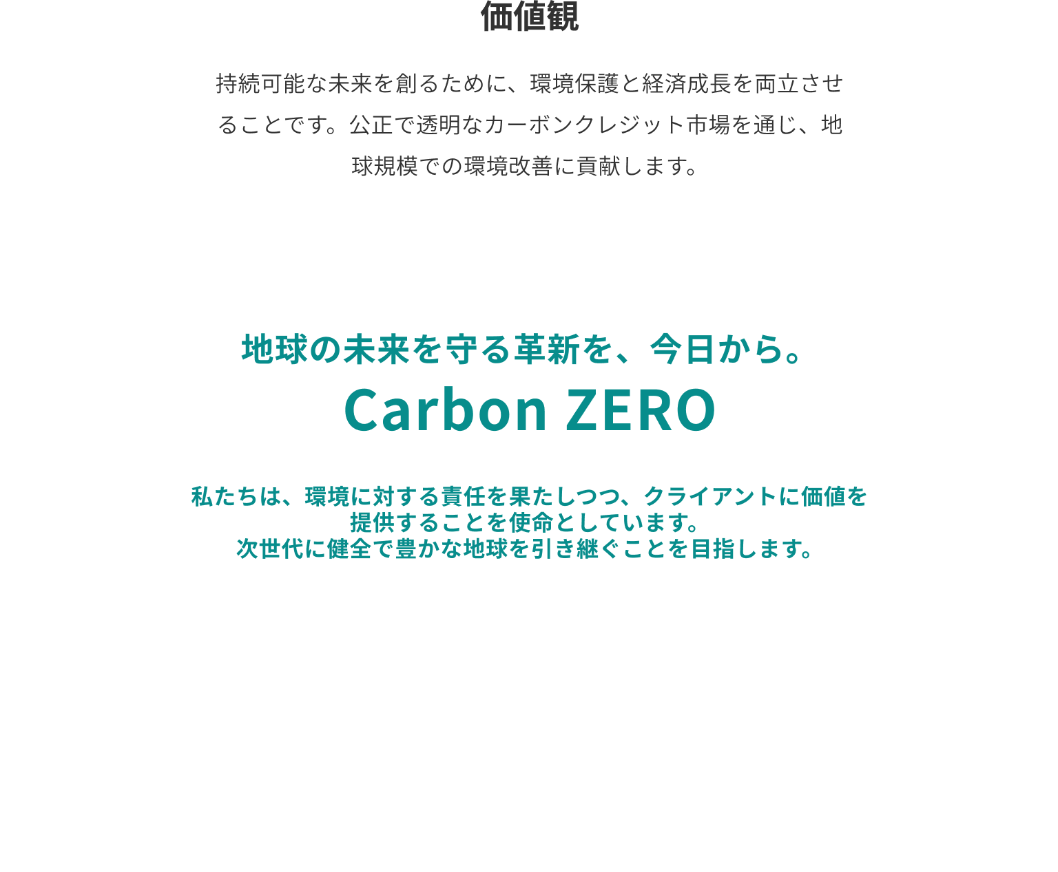 環境保護が企業の利益やブランド価値の向上につながる世界を実現したいと考えています。カーボンクレジットの導入により、企業が持続可能な取り組みを通じて、経済的なメリットを享受しつつ、社会全体で環境保護に貢献できる仕組みを作ります。